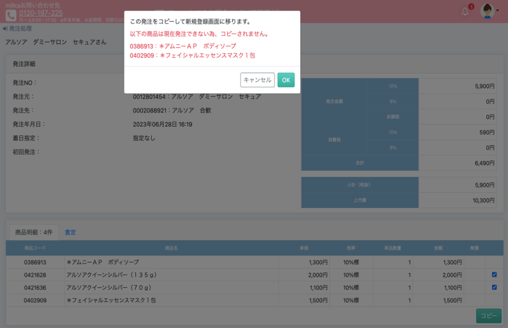 発注のコピー機能を利用したときに、当初は発注できていて、現在は発注不可となっている製品がある場合、システム側で自動的に除外して、コピー伝票を作成しています。
