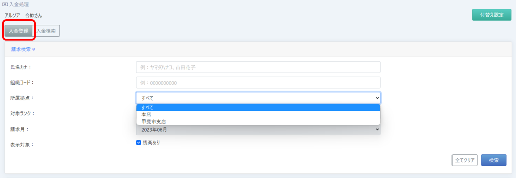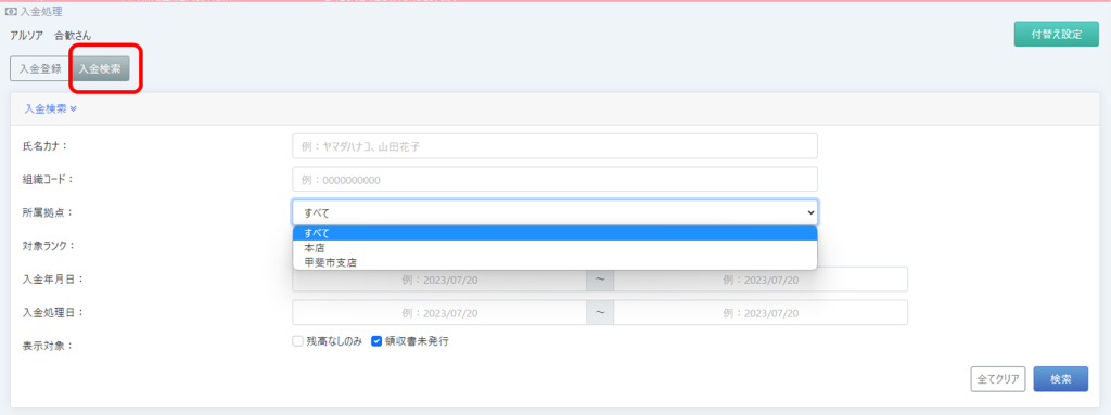 【修正後】入金登録画面でも、所属拠点での検索ができるようになりました
