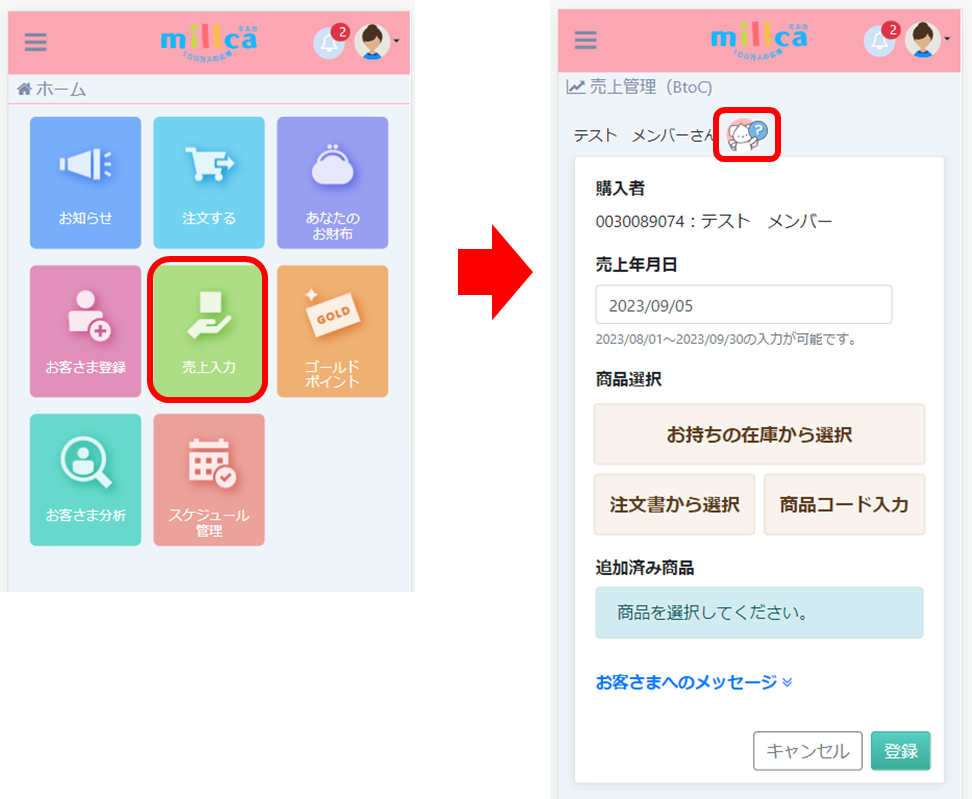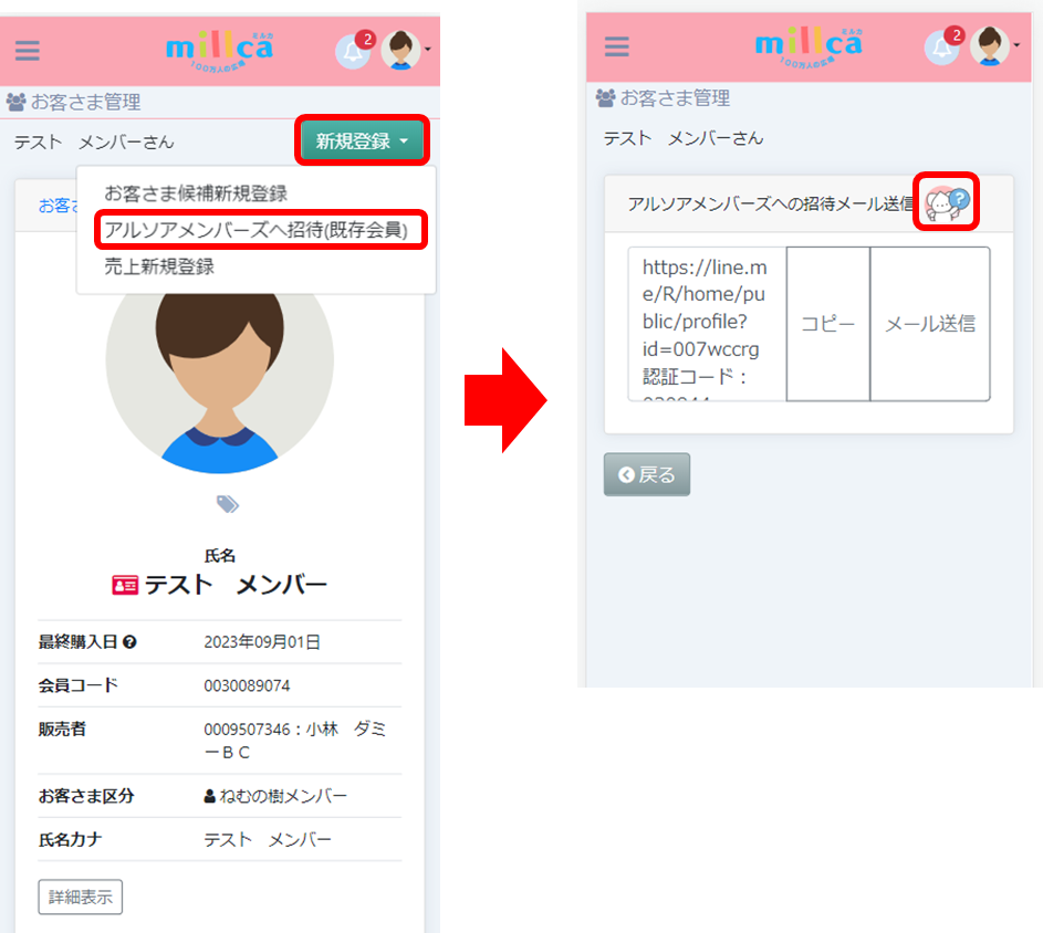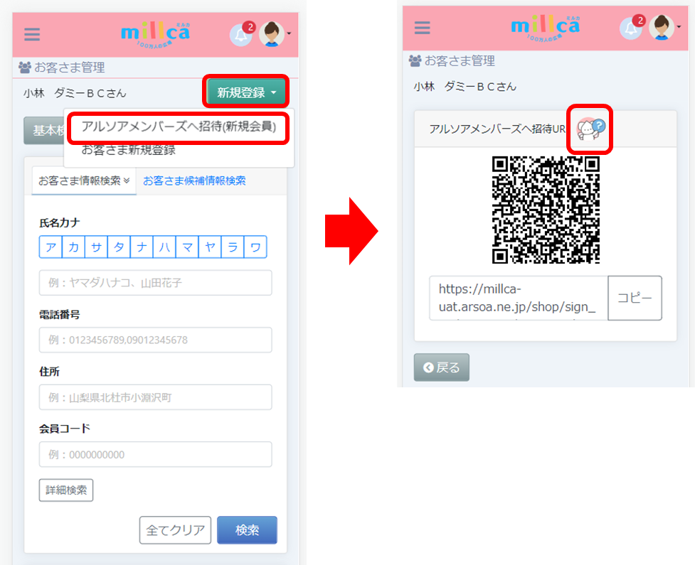 ⑤お客さま管理>(特定の)お客さま詳細画面>新規登録>アルソアメンバーズに招待(既存会員)