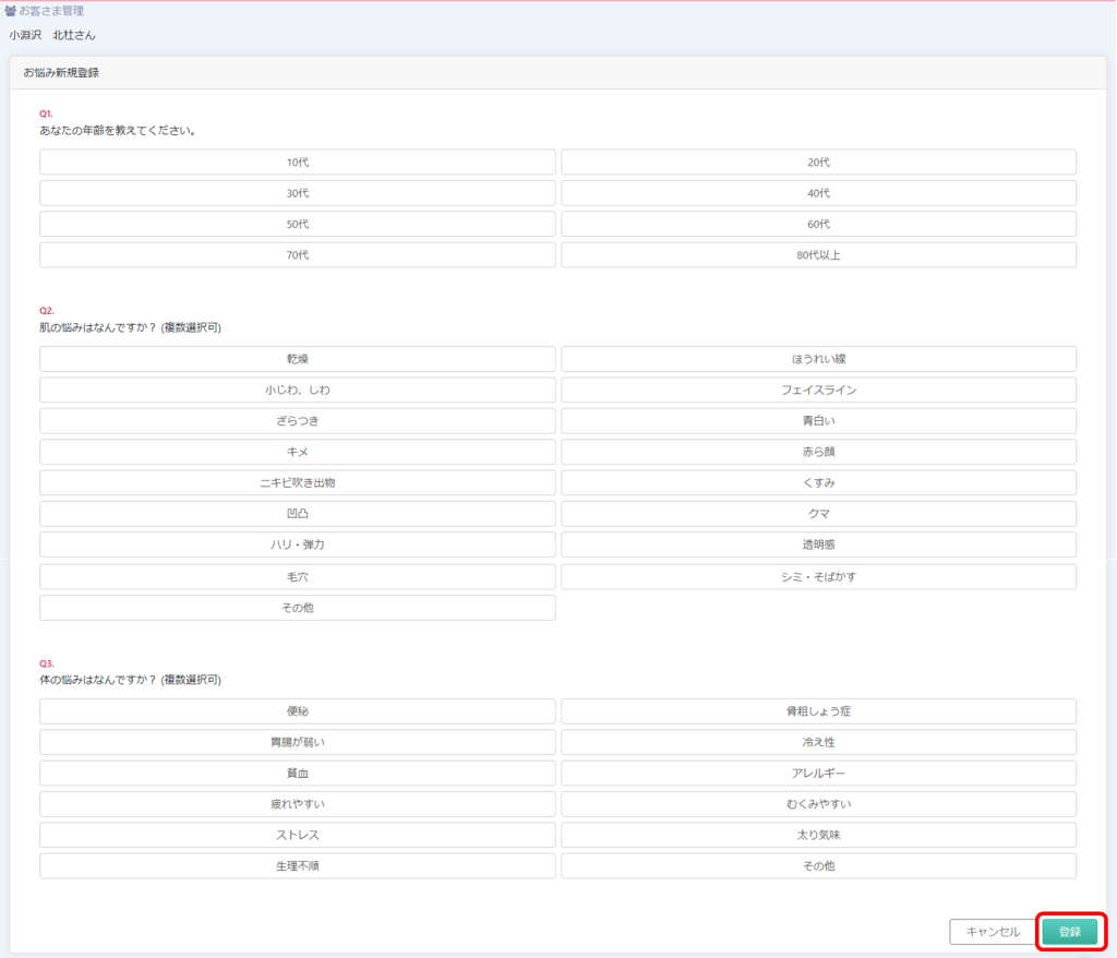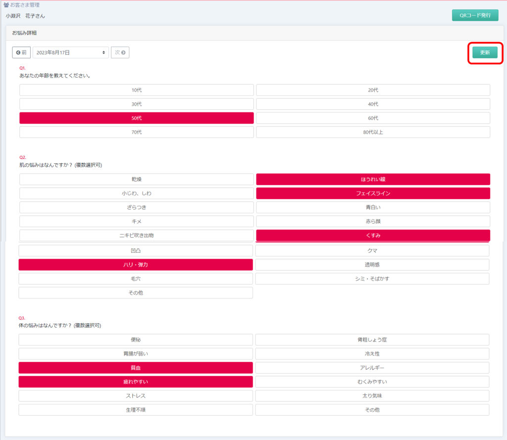 「お客さま管理」からお客さま情報詳細を開き、「購入分析」タブ内の「お悩み」を選択します。
