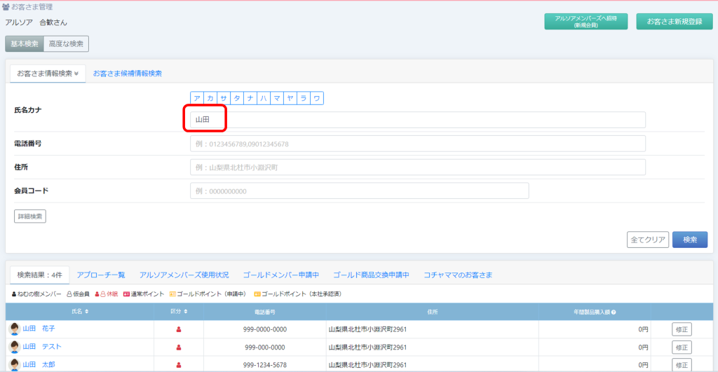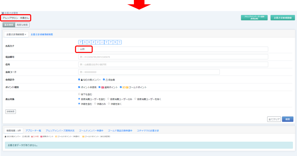 例えば、お客さま管理の検索条件に「山田」と入力していた場合、