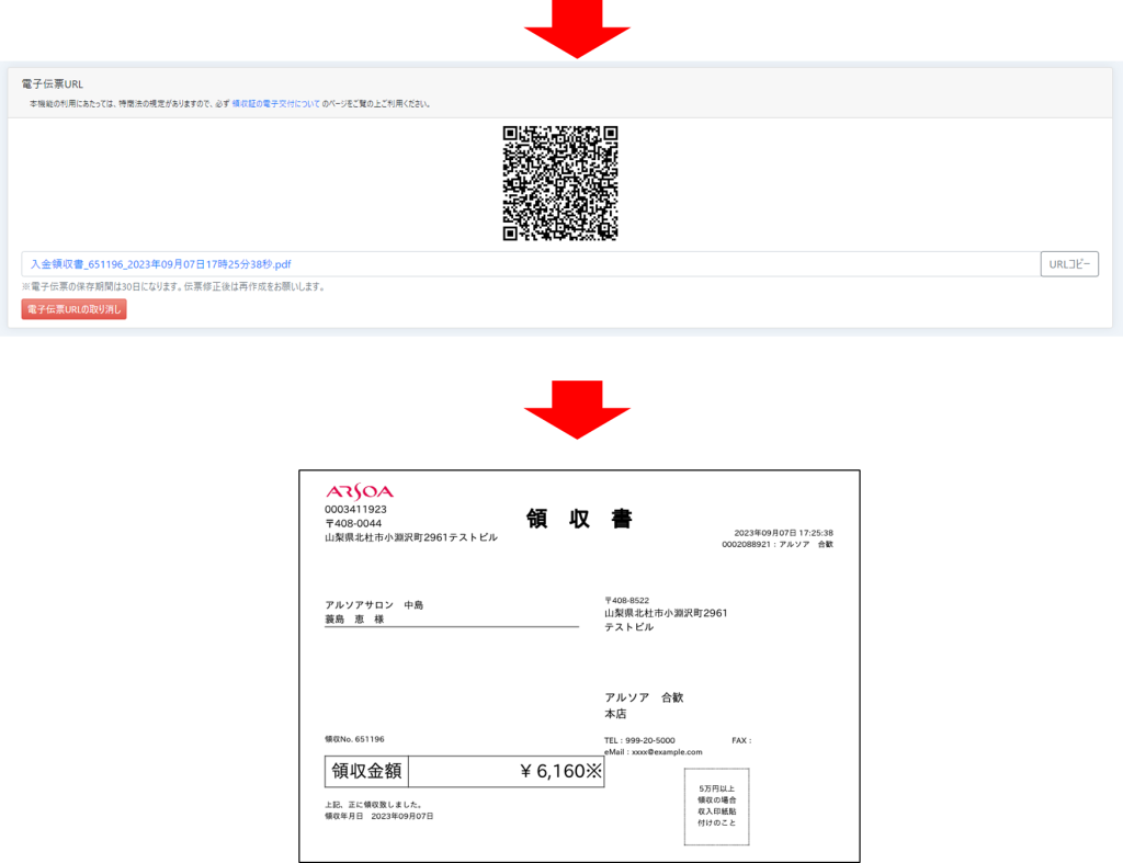 これまで、入金処理後の「領収書」は紙面印刷しかできませんでしたが電子伝票のご利用がいただけるように修正いたしました。お客さまのスマホでQRを読んでいただくか、コピーしてLINEやメールで送付することで紙面印刷や発送のお手間が省けます。