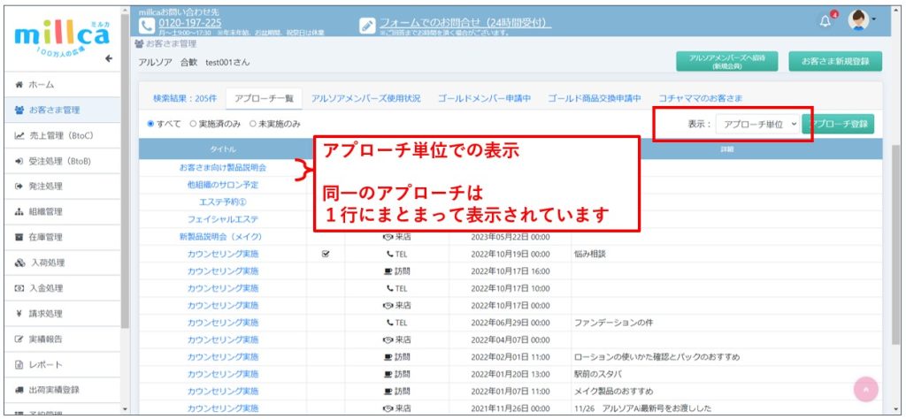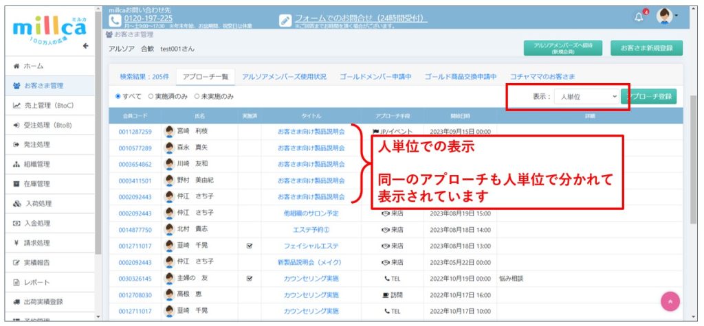 ホームお客さま・お客さま候補の管理【機能改善】アプローチ一覧において「人単位」と「アプローチ単位」で表示が切り替えられるようにしました(2023/9/26リリース) 2023/09/22 2024/08/23お客さま管理>アプローチ一覧アプローチ一覧タブで表示単位を「人単位」「アプローチ単位」で切り替えられるようにしました。