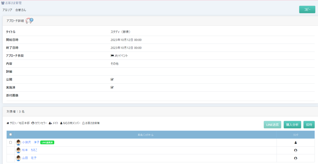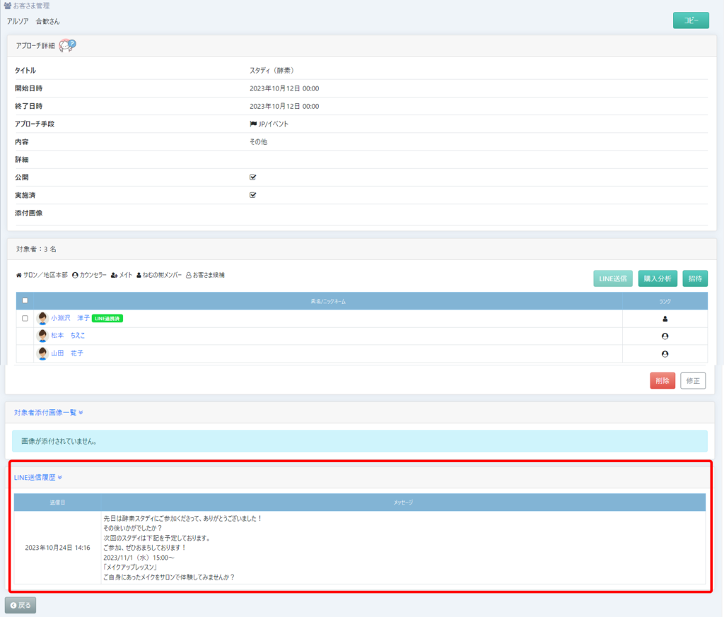⑥販売者側では、アプローチ詳細に、LINE送信履歴が残るようになっています