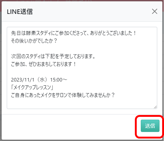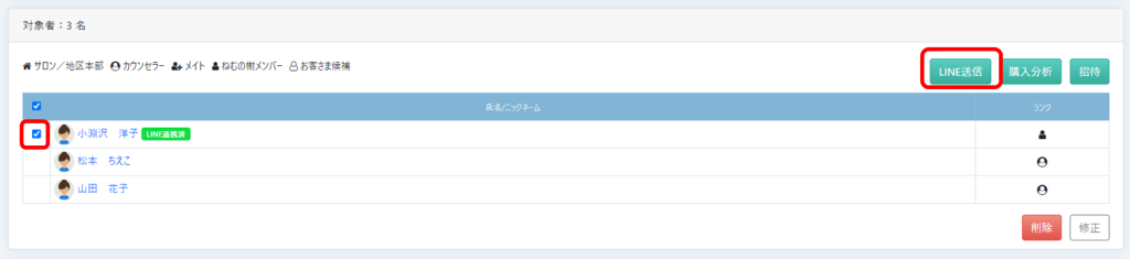 LINE連携を行っている方に☑して、「LINE送信」ボタンを選択します