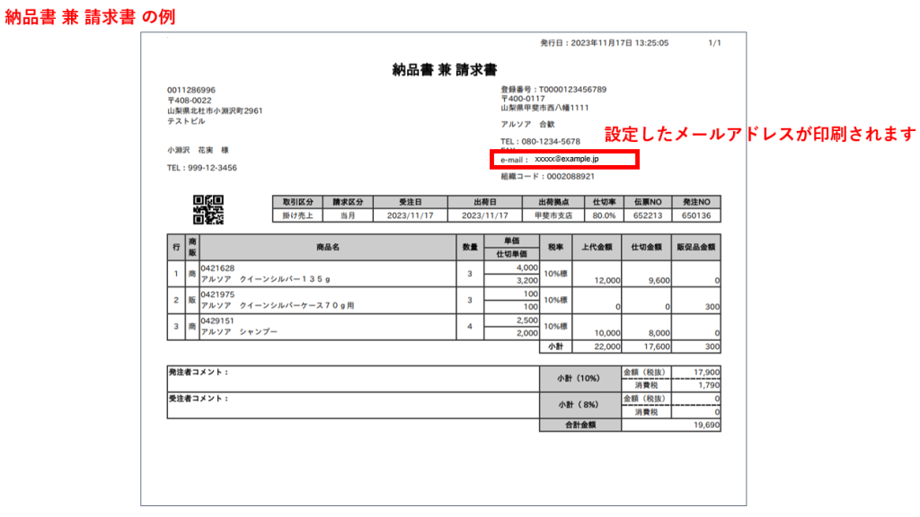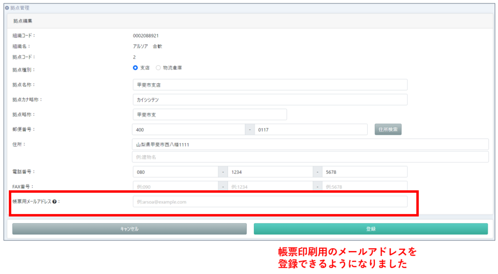 ホーム拠点管理【機能改善】拠点版を利用の際に拠点単位に帳票印刷用のメールアドレスを設定できるようになりました(2023/11/27リリース) 2023/11/24 2024/08/22マスタ管理>拠点管理拠点版を利用の際、拠点単位に帳票印刷用のメールアドレスを設定できるようになりました。メールアドレスが印刷される帳票は、以下の通りです。・領収書・売上伝票・納品書 兼 請求書