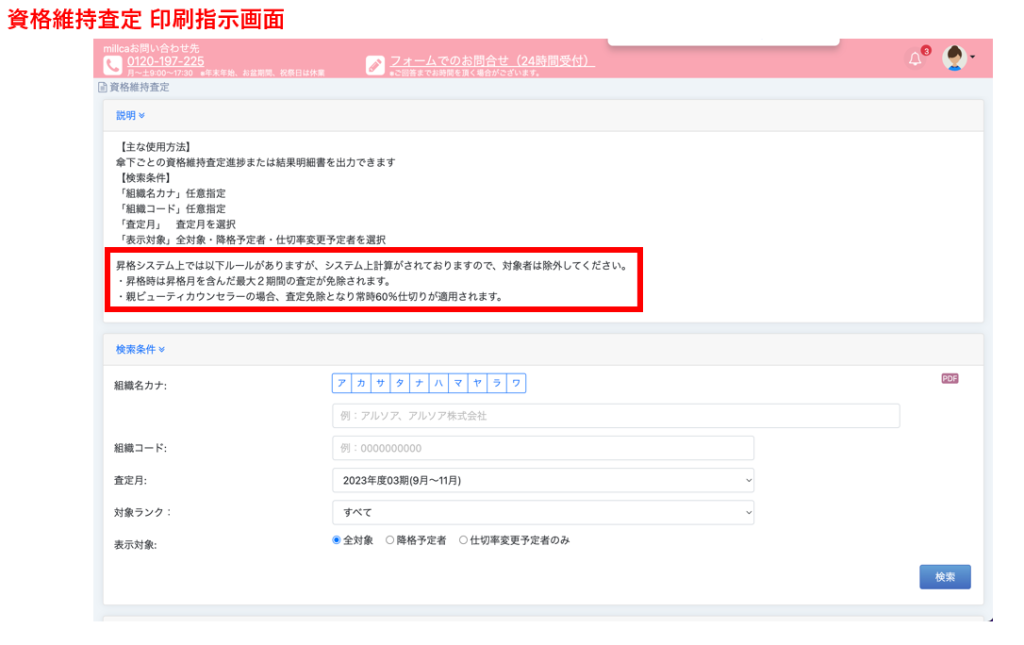 ホーム諸手当(販売奨励金、資格維持)【機能改善】資格維持査定について注意文言を表示、印刷するようにしました(2023/11/27リリース) 2023/11/24 2024/08/23レポート>資格維持査定資格維持査定の印刷指示画面と帳票に以下の注意文言を追加しました。