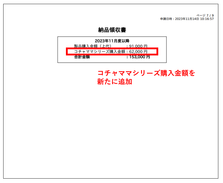 ホーム組織管理【機能改善】BC契約申請書を印刷した際の納品領収書にコチャママシリーズ本体購入額を追加しました(2023/11/27リリース) 2023/11/24 2024/08/27ホーム>組織管理BC契約申請書を印刷した際の納品領収書に、コチャママシリーズ本体購入額を新たに出力するようにしました。