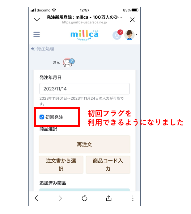 ホームBC向け簡易画面【機能改善】BC向け簡易画面の発注からも「初回フラグ」が利用できるようになりました(2023/11/27リリース) 2023/11/24 2024/08/29ホーム>発注処理簡易入力画面の発注処理でも「初回フラグ」が利用できるようになりました。