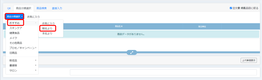 ただし、販社からのおすすめ製品に関しては注文書掲載品以外も登録していることが多いため