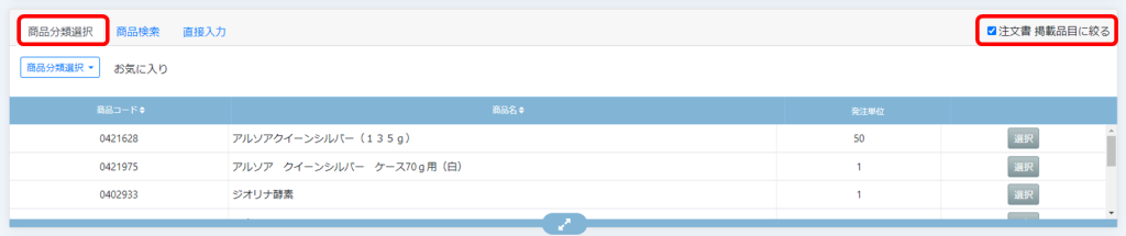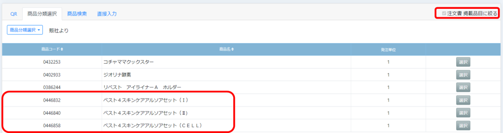 自動的に「注文書掲載品に絞る」が無効化され、注文書に載っていない製品(例:プロモーション品など)が表示されるようになりました。