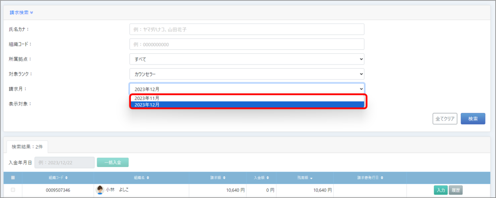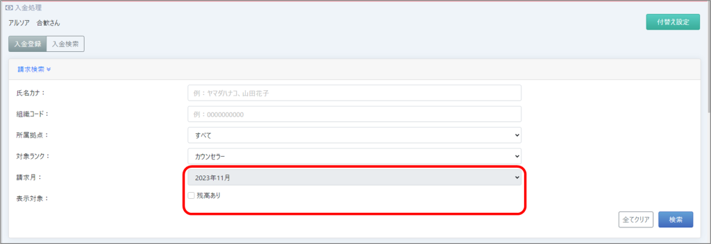 12月度内に入金処理を行うためには「請求11月」「残高ありチェック」を外して検索をかけて