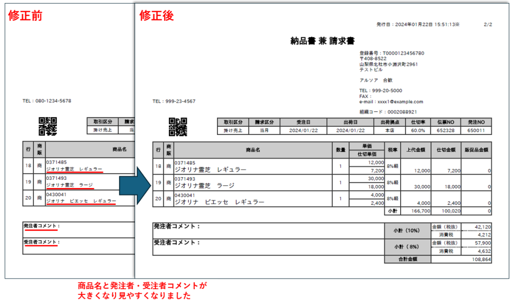 ホーム請求処理【機能改善】納品書兼請求書のフォントサイズを大きくして見やすくしました(2024/1/29リリース) 2024/01/26 2024/08/22請求処理>請求書発行「納品書兼請求書」の商品名および、発注者コメント、受注者コメントのフォントサイズを大きくして見やすくなるように改善しました。