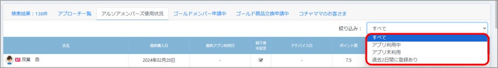 メンバーズ利用状況の絞り込み選択が「アプリ利用中」「アプリ未利用」「過去2日間に登録あり」