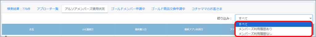 関連画面: お客さま管理>アルソアメンバーズ使用状況タブ
