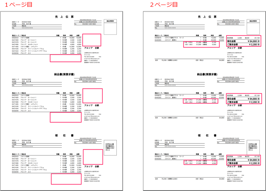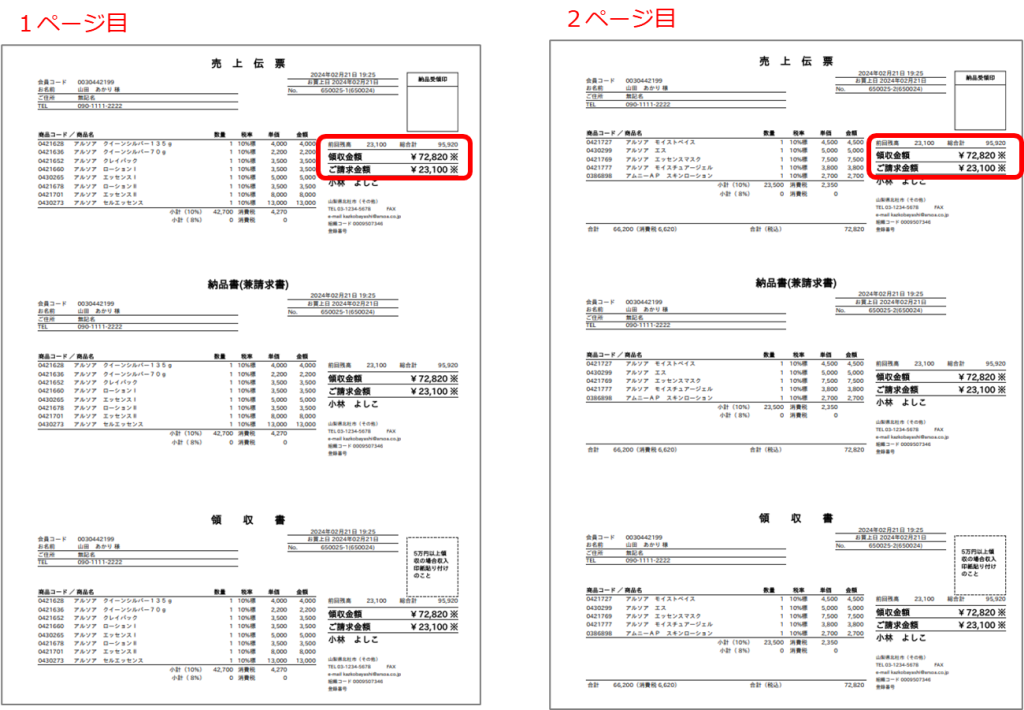 (修正前)複数ページの伝票の全ページに「領収金額」「ご請求金額」が表示されていた