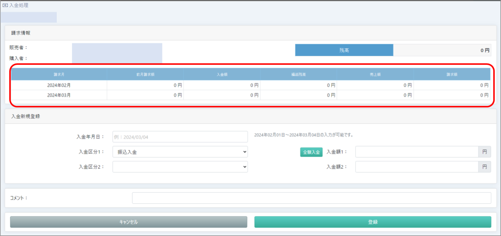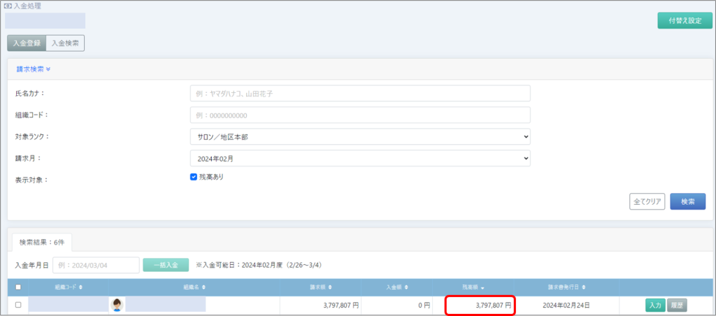 関連画面:「入金処理」>「入金登録」>「検索結果」