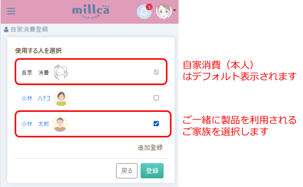 本人への売上登録と同時に、ご一緒に製品を利用されるご家族を入力できます。