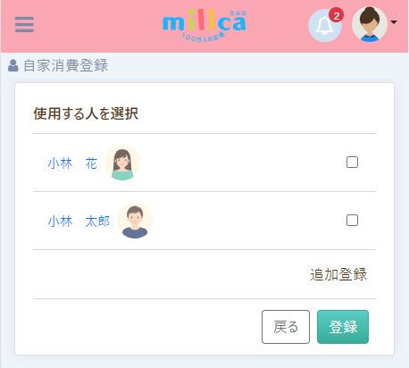 本人がデフォルト表示されます。ご本人に売上計上されますので選択チェックは外せません。ご家族も一緒に利用される場合は選択しますと利用履歴が残ります。