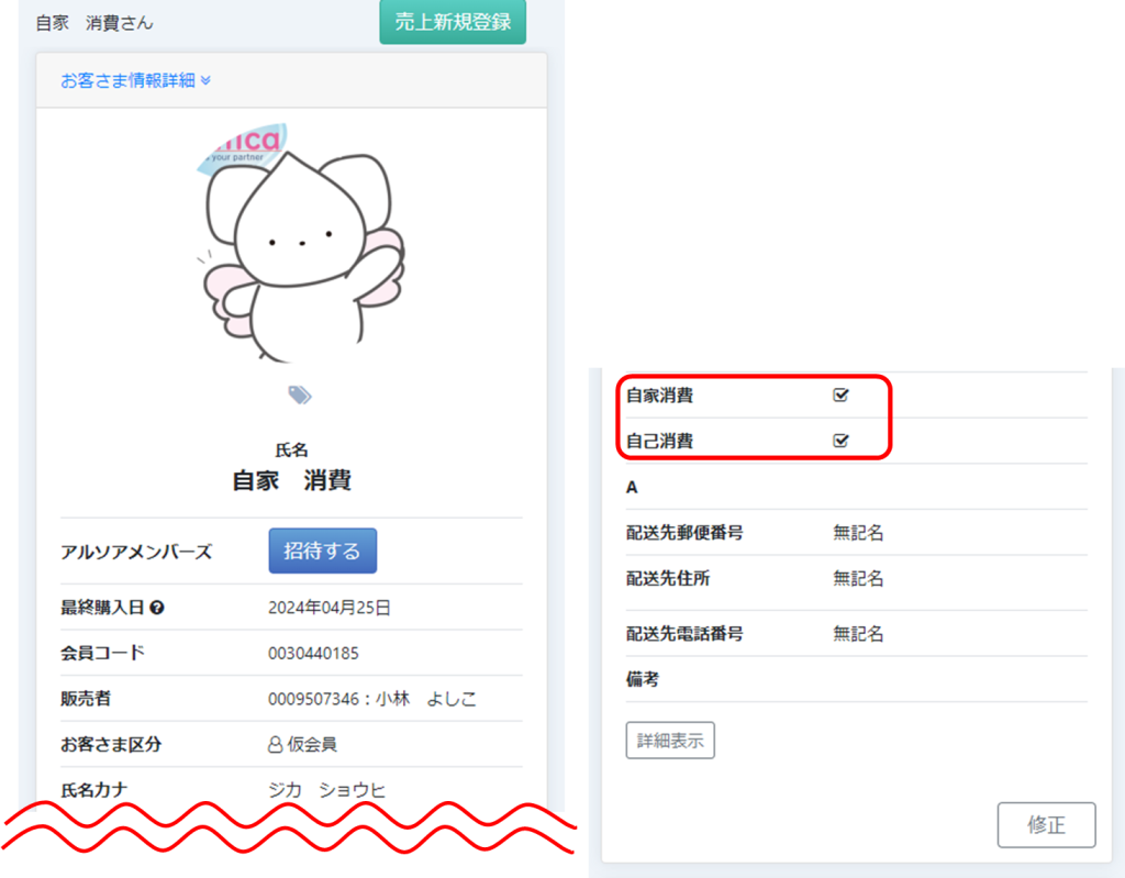 本人は「自家消費」と「本人」項目にチェックが入っているお客さま情報となります。