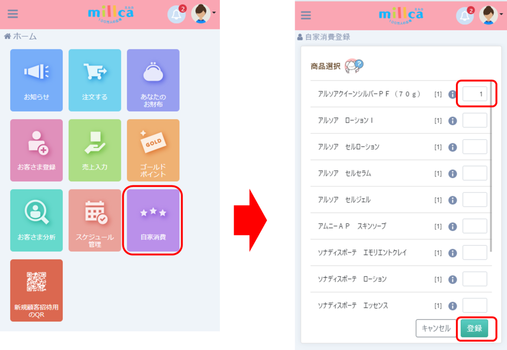 BC簡易画面「自家消費」メニューを選択後、計上する製品を選択します(こちらは変更ありません)