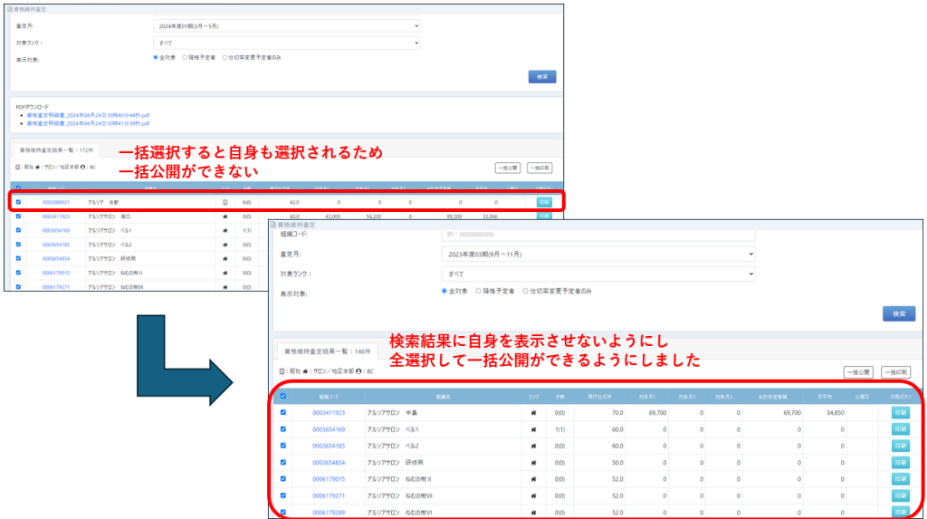検索結果から自身の査定を表示しないようにし、全選択して一括公開をできるようにしました。