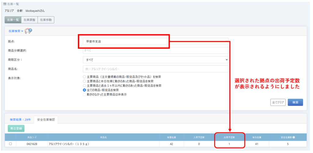 ホーム在庫【不具合修正】安全在庫管理の出荷予定数が拠点ごとになっていない問題を修正しました(2024/7/29リリース) 2024/07/26 2024/08/20 在庫一覧→安全在庫管理に表示されている「出荷予定数」について、拠点ごとの数値になっていなかったため、拠点ごとの出荷予定数が表示されるように修正しました。