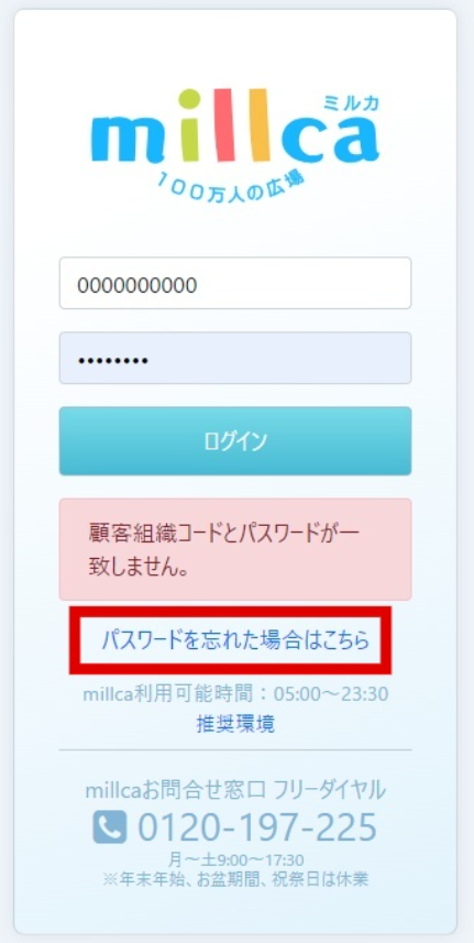 millcaの初期パスワードは一律、組織コードとなっていますので