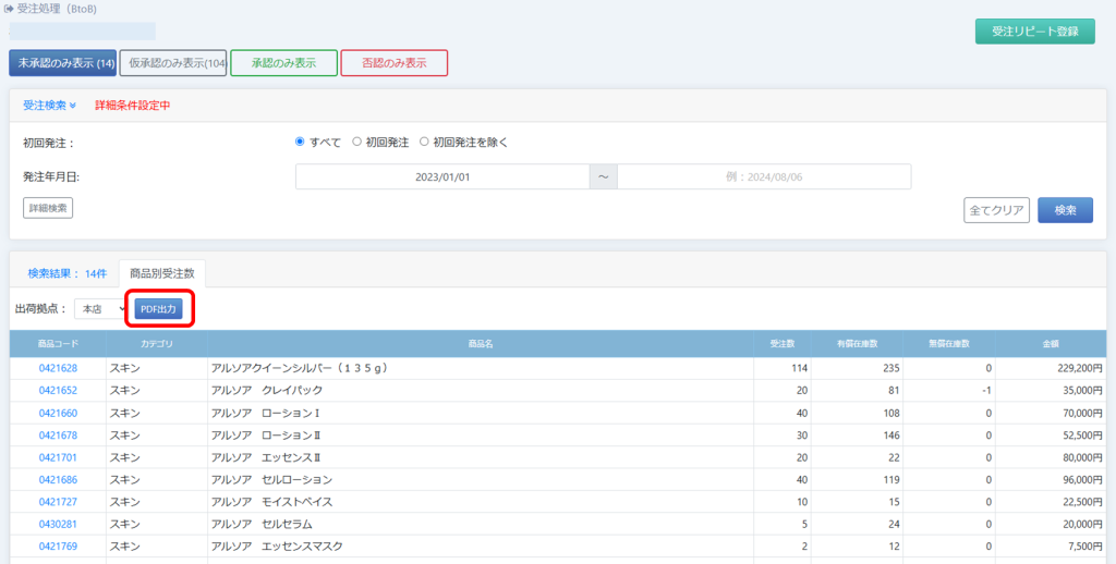 未承認のみ表示>商品別受注数タブ