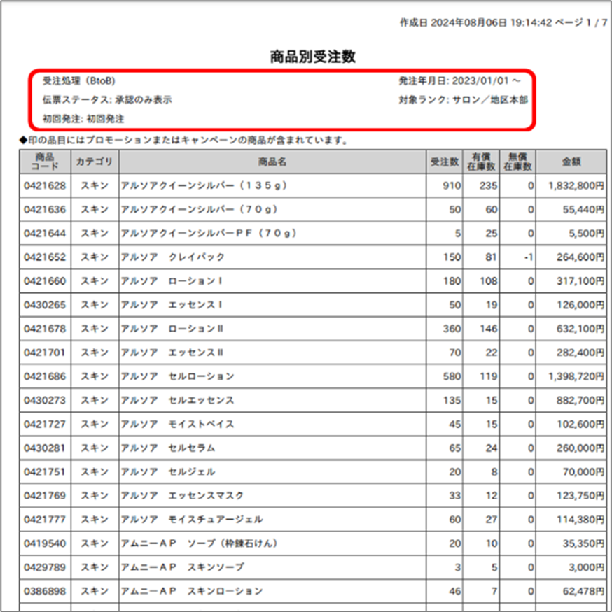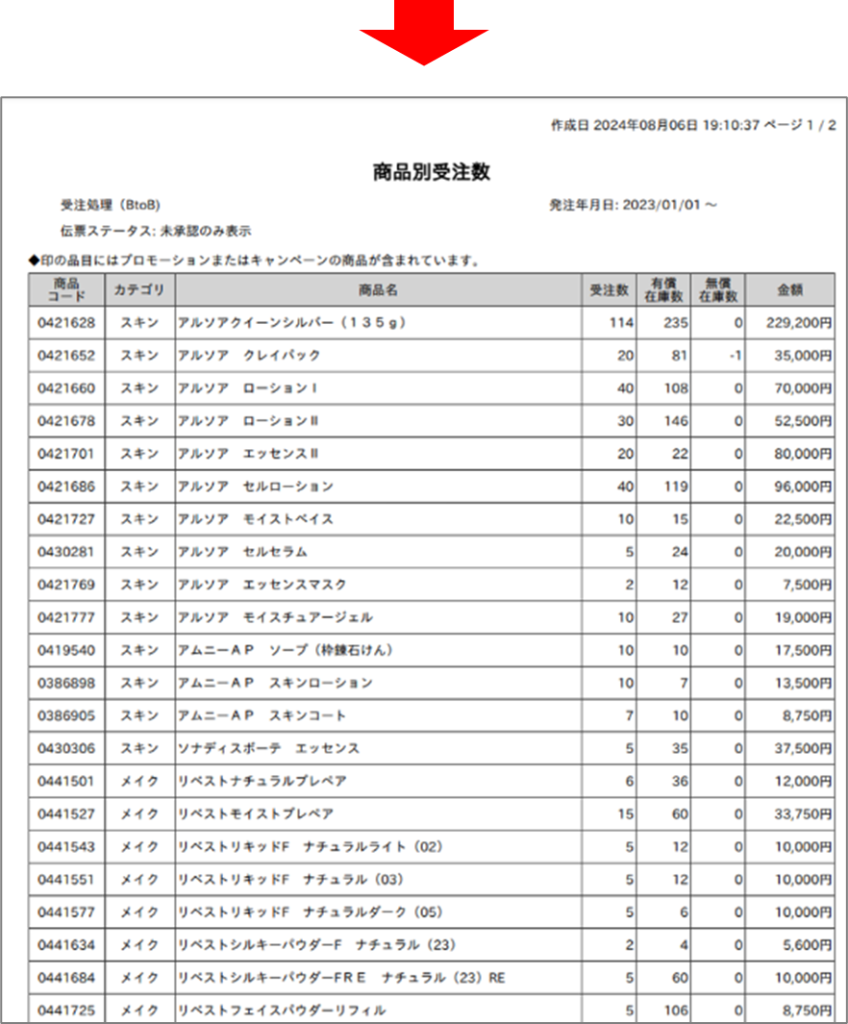 受注処理(BtoB)画面の商品別受注数タブを印刷して