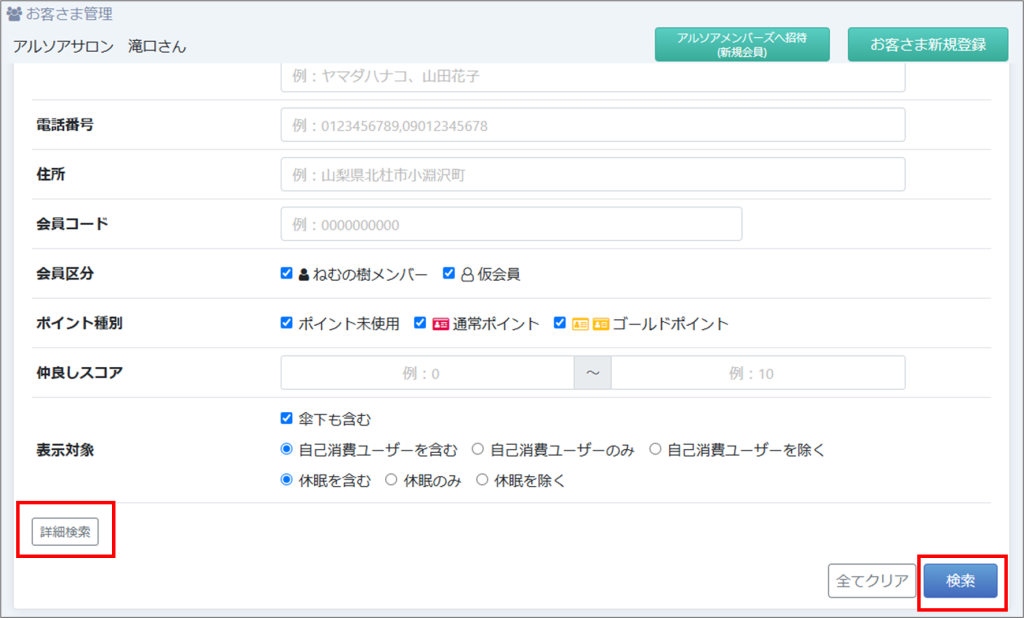 ご自身のmillca環境で、お客さま管理を開き「詳細検索」で