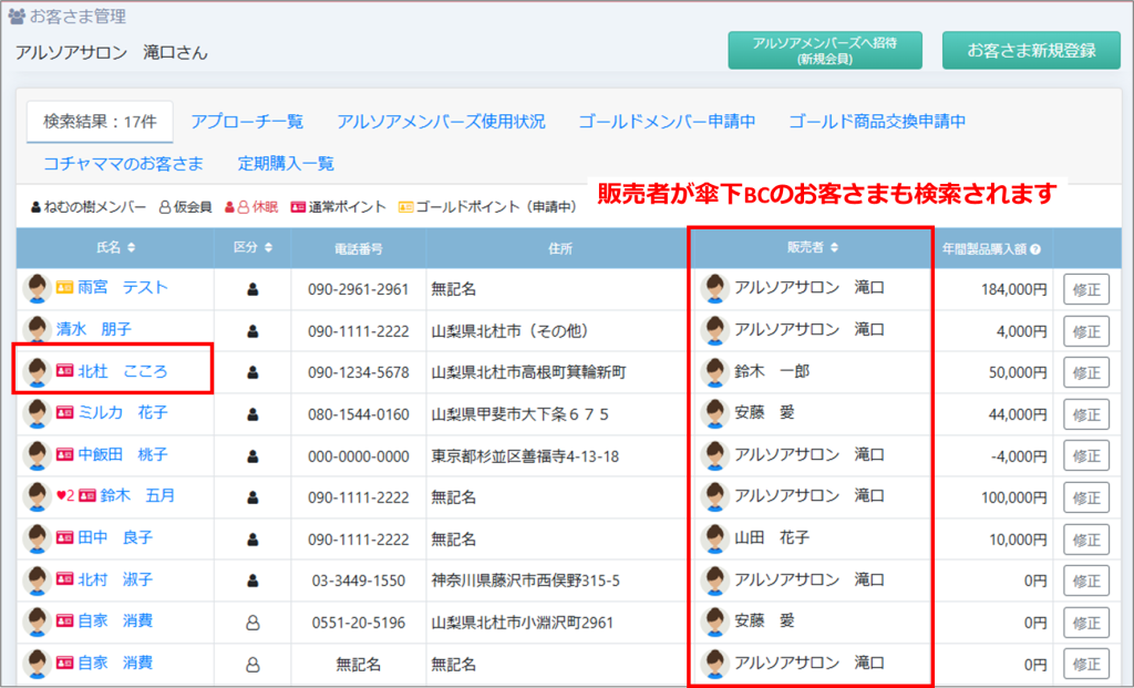 ご自身のお客さまに加え、傘下のお客さまが検索結果に表示されますので