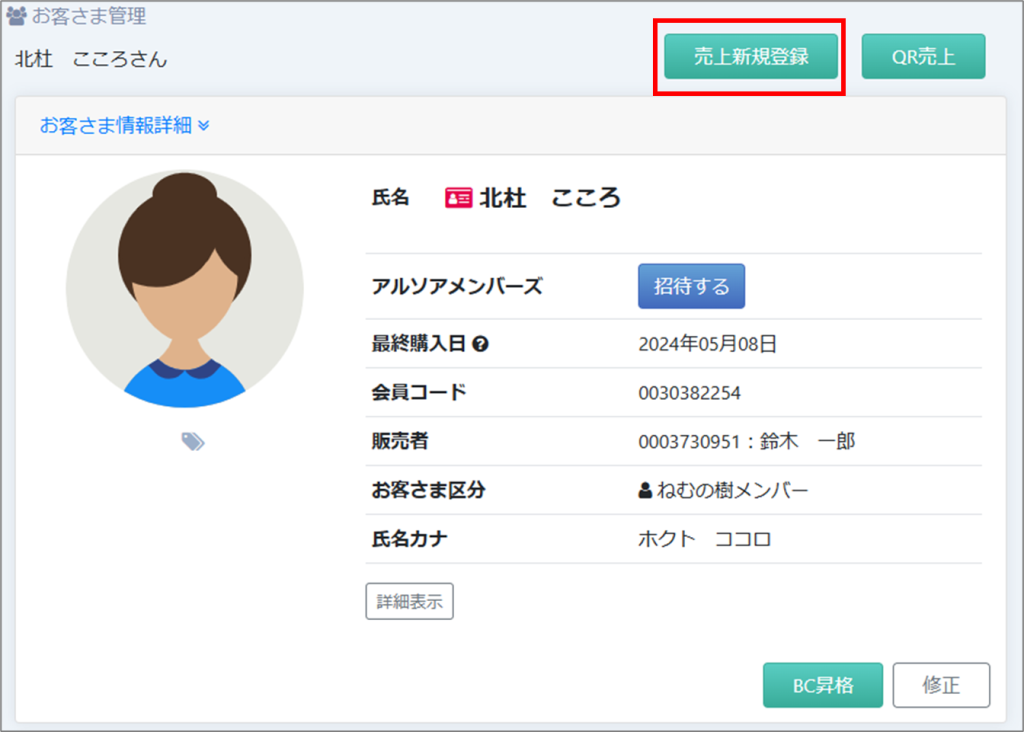 お客さま詳細を表示して、「売上新規登録」を行います。