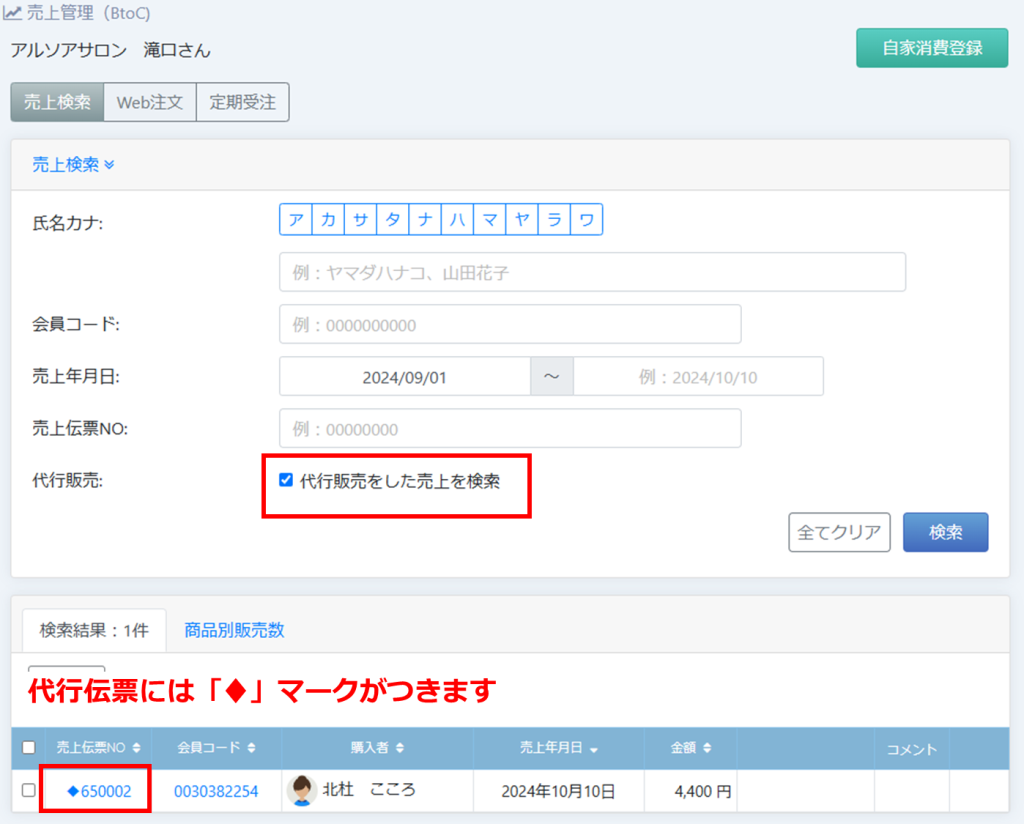 「代行販売をした売上を検索」にチェックすることで検索されます。