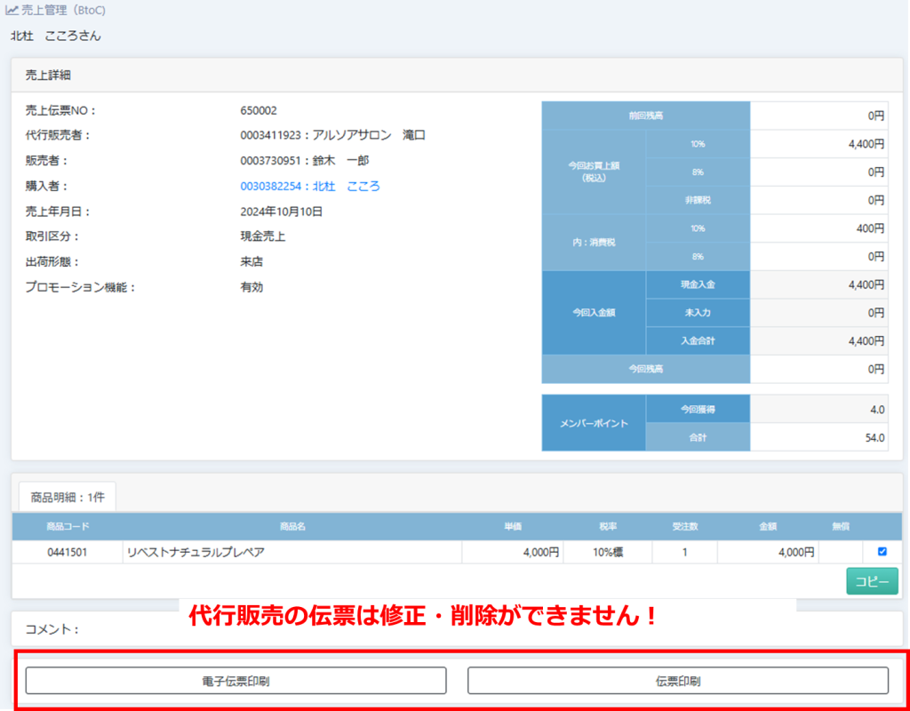 「代行販売者→傘下のお客さま」の伝票計上と同時に「実際の販売者→お客さま」伝票が自動で計上されます。実際の販売者の売上管理(BtoC)画面で伝票が見えます。