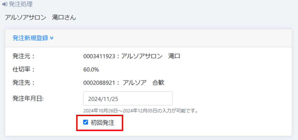 注文者側が、「当月度の資格維持査定分はクリアしているので、この伝票は翌月度扱いにしてほしい」という意思表示をするため、「発注処理」をするとき「初回」チェックを入れることができるようになっています。