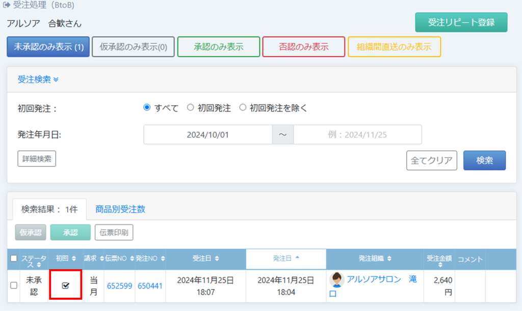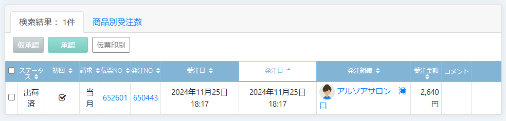 販売者側では該当の伝票が、未承認画面に入ってきますので仮承認を行います。