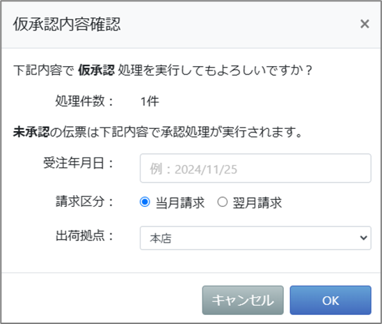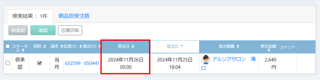 上記の確認画面で何も設定しないで仮承認処理を行うと、伝票の受注年月日が自動で