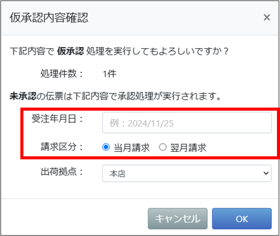 販売者側で未承認伝票を仮承認とするタイミングで受注年月日が翌月度に書き変わります