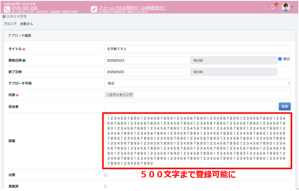 ホームお客さま・お客さま候補の管理【機能改善】アプローチ登録画面において内容を500文字まで登録できるようにしました(2025/1/27リリース) 2025/01/24 2025/12/12お客さま管理>アプローチ一覧>アプローチ登録アプローチ登録画面において、内容を500文字登録できるように項目を拡張しました。