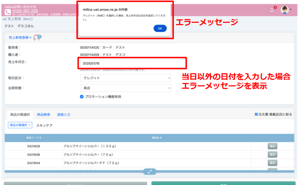 ホーム売上(BtoC)【機能改善】売上登録時にAMC売上の場合、売上日に当日しか設定できないようにしました(2025/1/27リリース) 2025/01/24 2025/12/12ホーム>売上管理(BtoC)売上登録時にAMC売上の場合、売上日に当日以外の日付を設定した場合、エラーメッセージを表示させ、当日以外の日付を設定できないようにしました