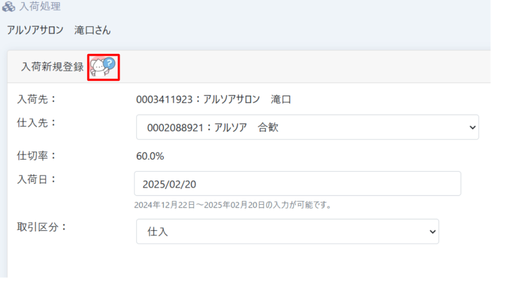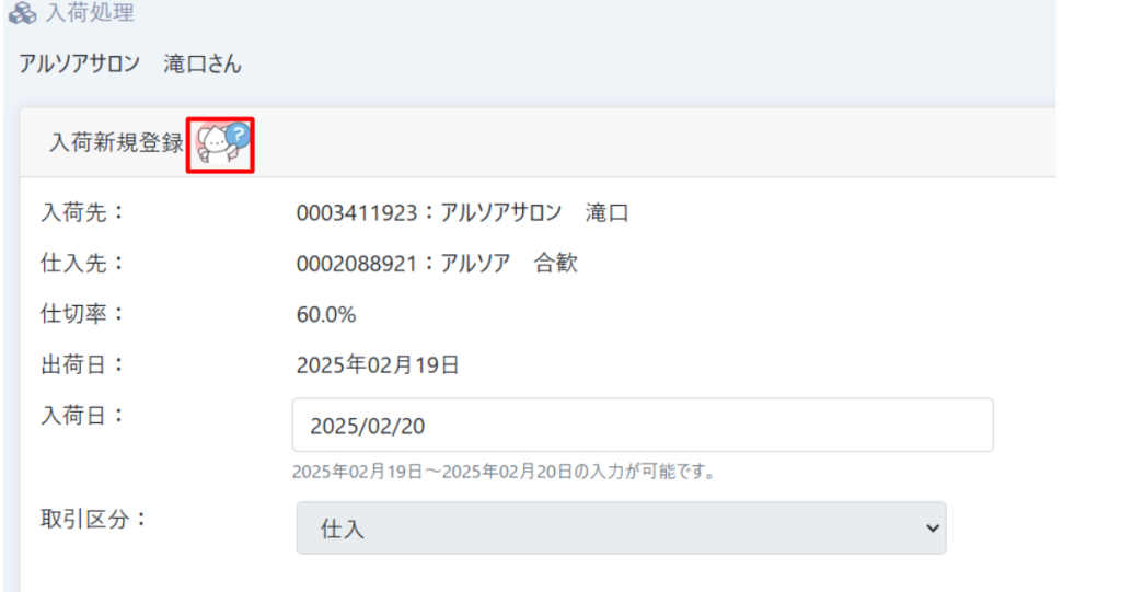 ホーム>入荷処理-入荷ー入荷新規登録 の右横の部分にモコアワちゃんアイコンを追加しました。