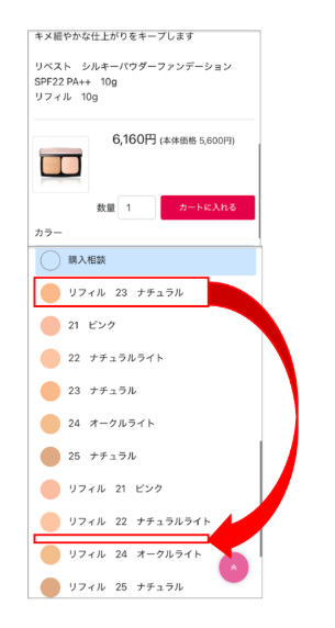 ② 例えば、シルキーパウダーファンデーションの場合ですと「リフィル23」が一番うえに表示されてしまっておりましたので、「リフィル22」の下に表示されるよう修正いたしました。