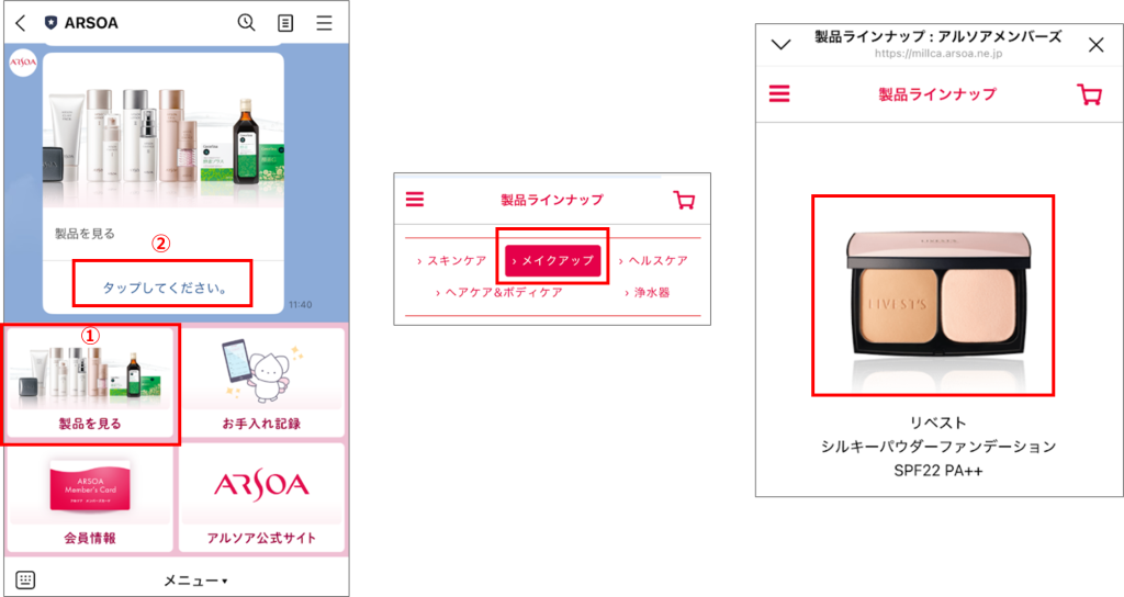 ① アルソアメンバーズから「製品を見る」を選択し「メイクアップ」カテゴリから