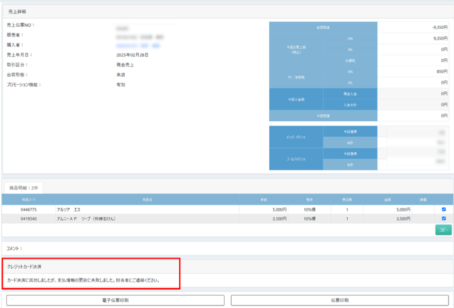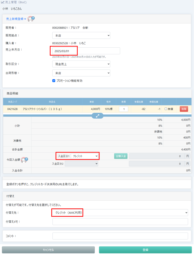 売上伝票計上時の入金区分が「クレジット」、付け替え先「クレジット(AMC利用)」
