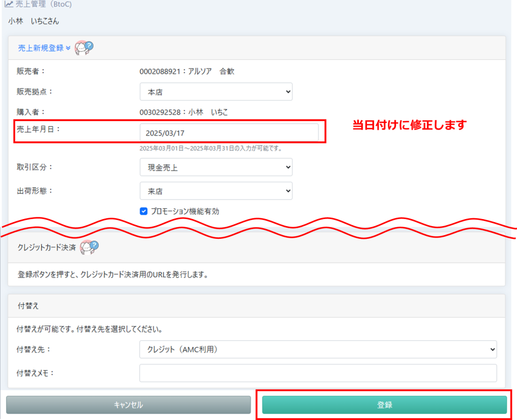 と指定された場合、売上日付は当日のみ指定可能となるように変更させて頂きました。