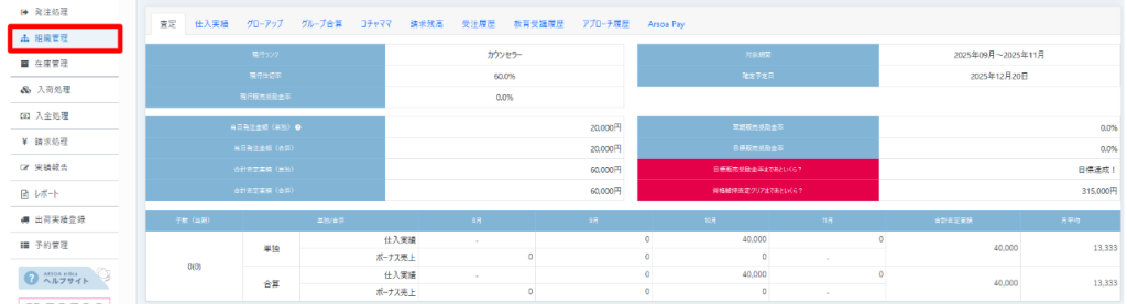 組織管理内にあるタブに数字が反映されるタイミングをご案内いたします。