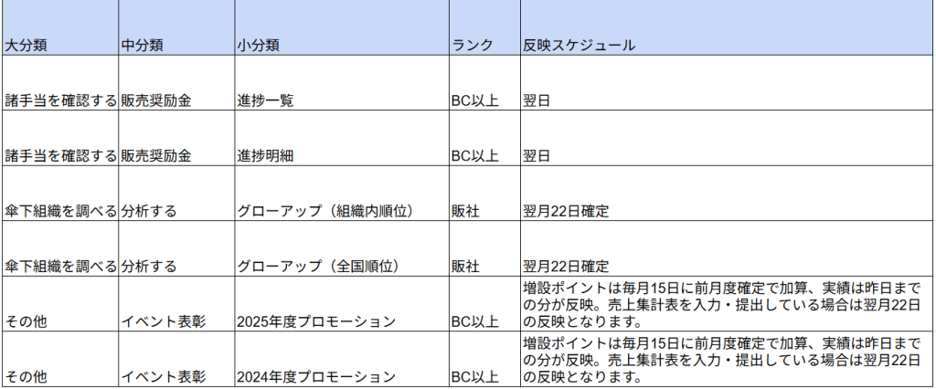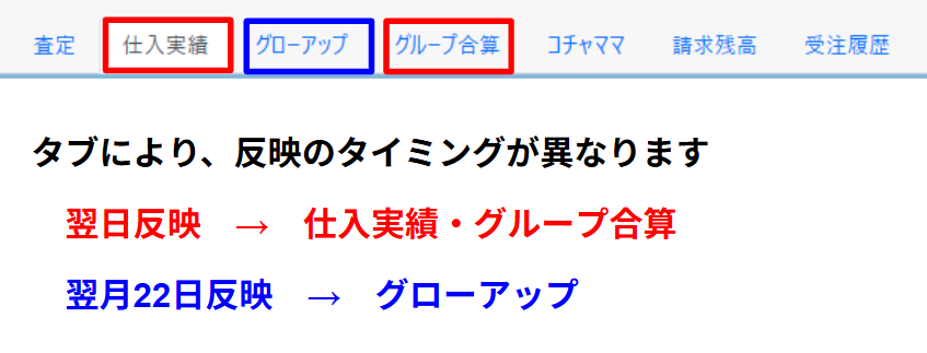 仕入実績やグローアップなどの成績に関する数字は基本的に翌日ですが、売上集計表を入力・提出している場合は翌月22日の反映となります。
