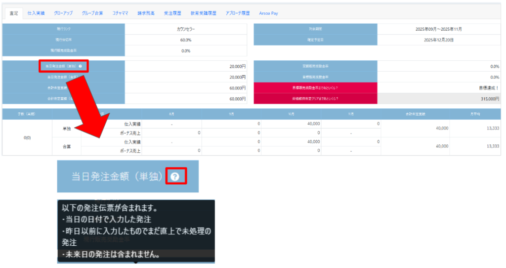 ※①のデータには、当日発注金額(単独)横の【?】アイコン にあるように未来日の発注は含まれません。