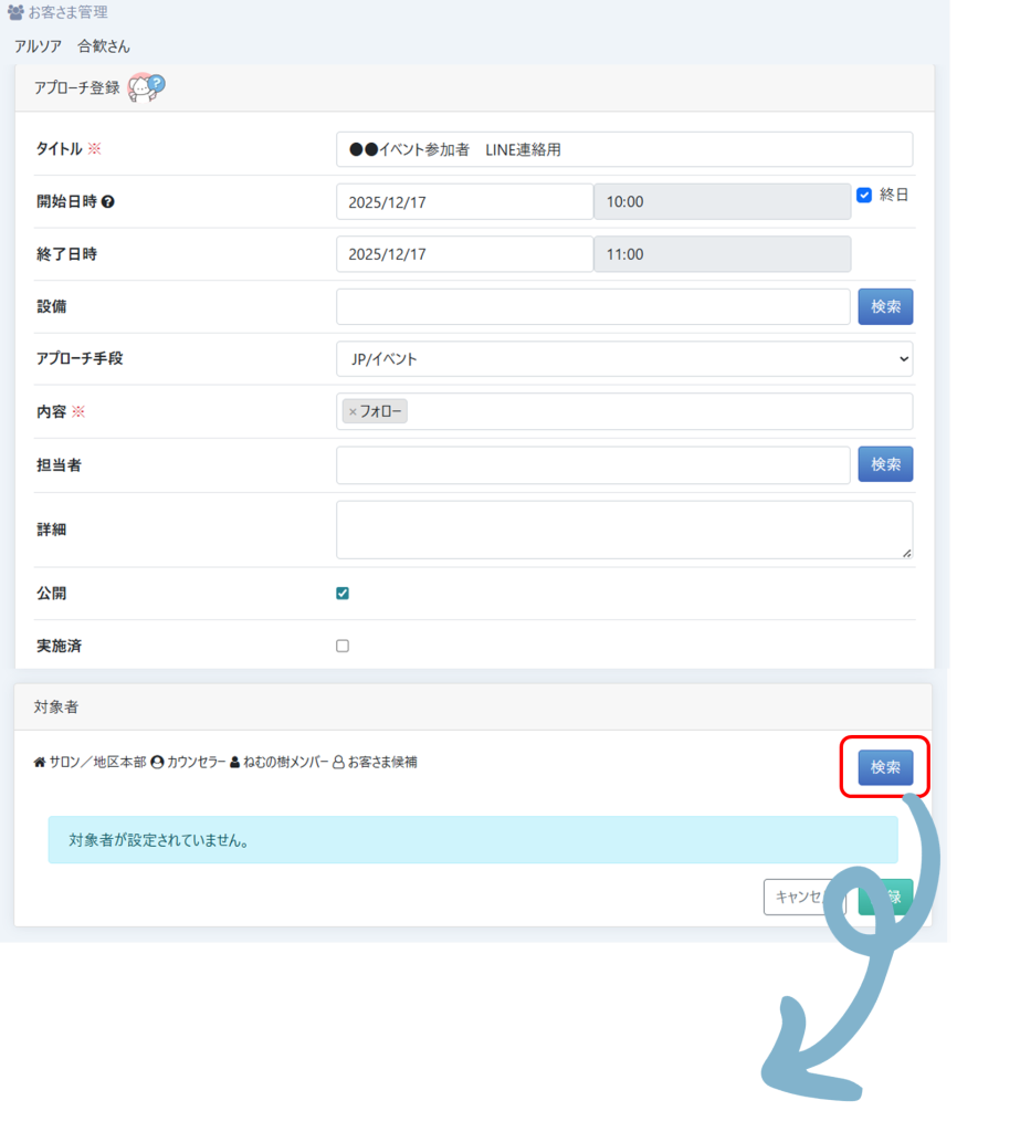 お客さま管理>アプローチ一覧タブ>アプローチ登録